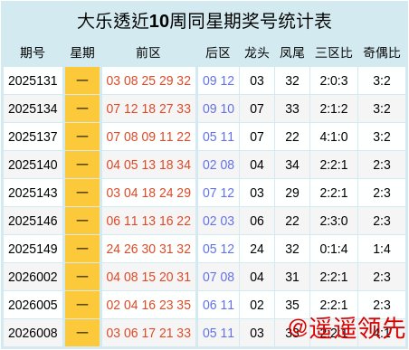 龙头凤尾分析:上周星期一的龙头号码为03,属于奇数,凤尾号码为33,属于奇数。